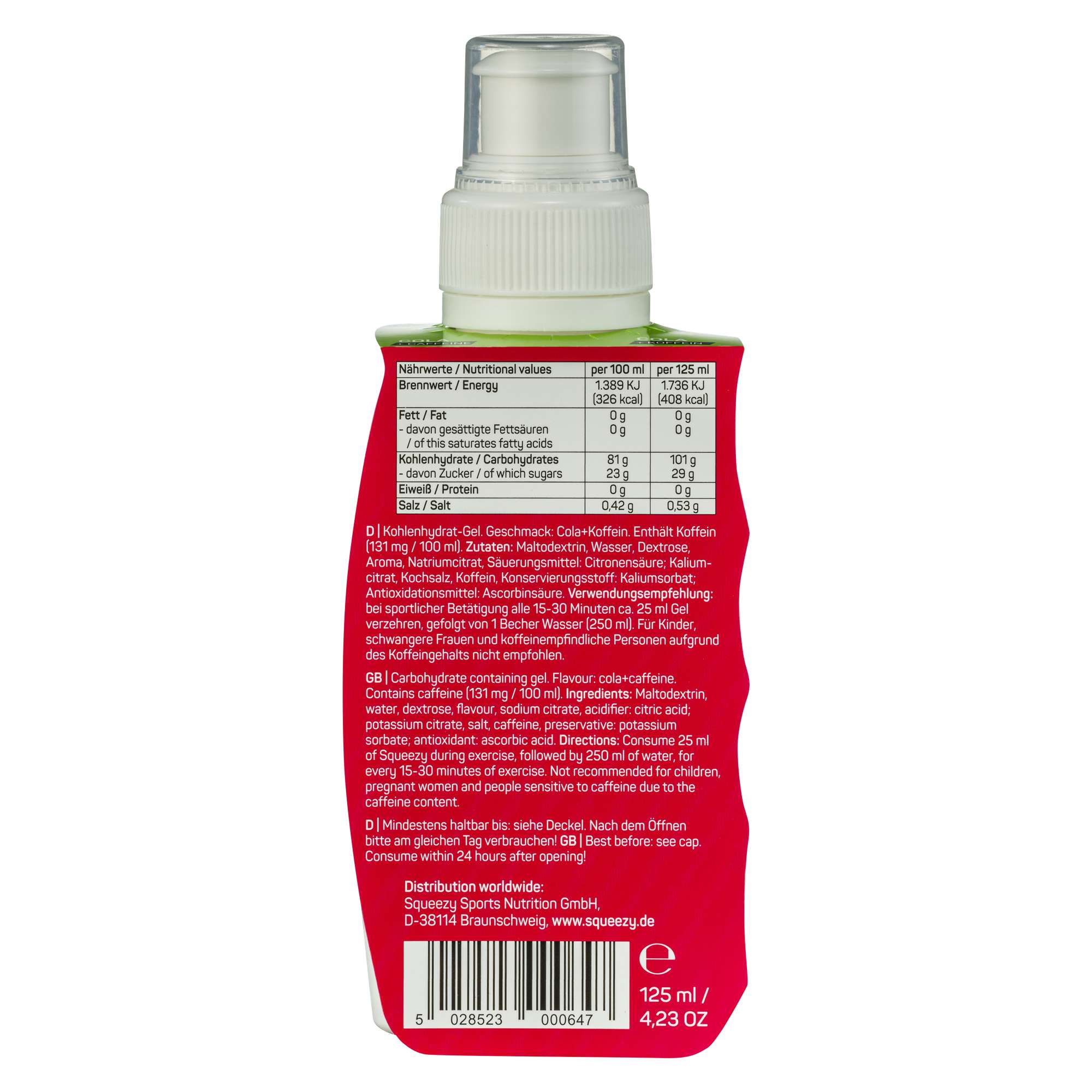 Ernæringsmessig er energigelen på flaske så godt som identisk med gelen som er i porsjonsposene med koffein. Den er like skånsom mot magen og inneholder de samme karbohydratene samt elektrolytter og salter. Gelen på flasken er imidlertid litt tynnere i konsistensen.