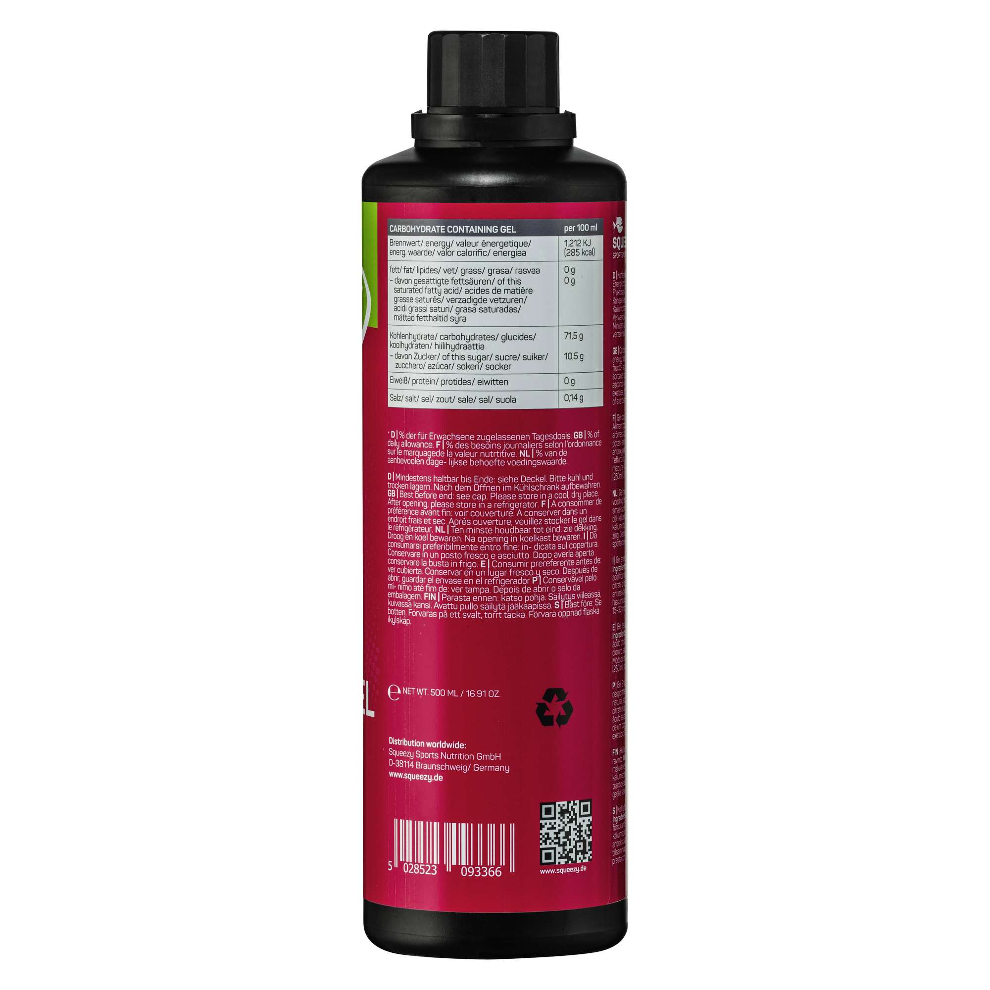 Ernæringsmessig er energigel på flaske så godt som identisk med gelen som er i porsjonsposene. Den er like skånsom mot magen og inneholder de samme karbohydratene samt elektrolytter og salter. Gelen på flasken er imidlertid litt tynnere i konsistensen.