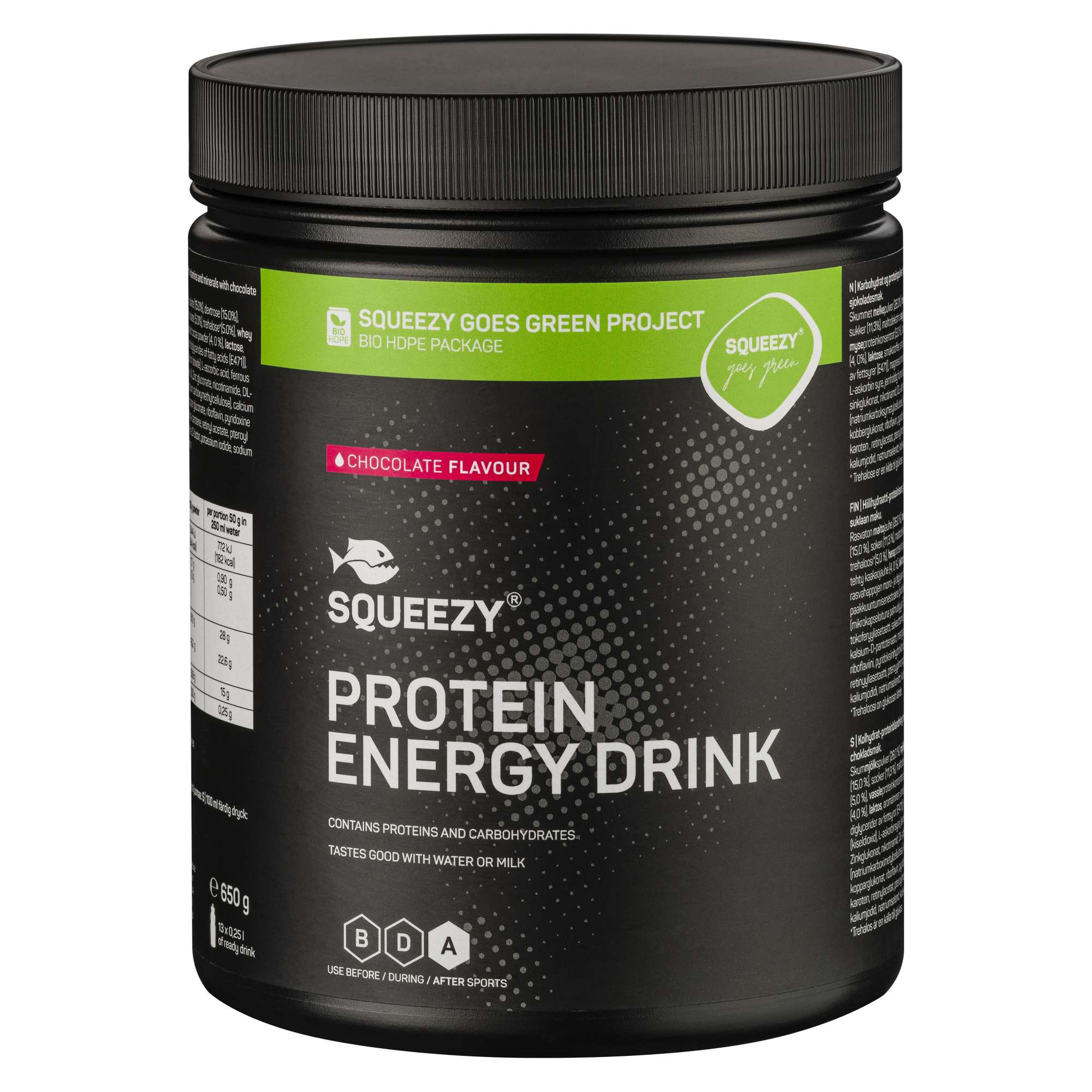 SQUEEZY Protein Energy Drink er et avansert restitusjonsprodukt med delikat sjokoladesmak. Den inneholder 30 % proteiner, peptider, aminosyrer, 60 % karbohydrater og en bred miks av mineraler og vitaminer for å re-sette immunforsvaret. Inntas rett etter trening eller konkurranse blandet ut i vann eller skummet melk.